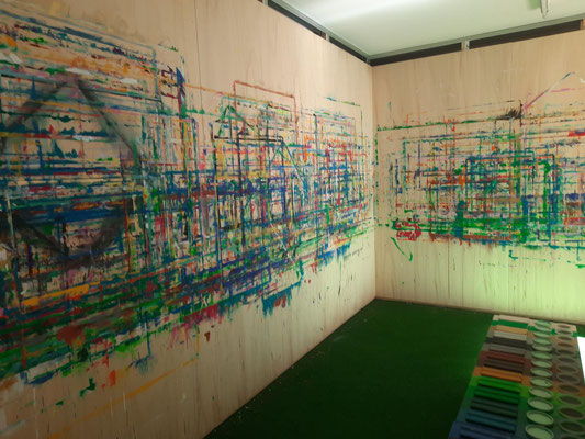 Die Arbeitsweise und die Regeln werden für die Kinder automatisch zu einem absoluten Bedürfnis. Sie erleben einen immer wiederkehrenden Wechsel zwischen dem gemeinsamen Bereich am Farbpiano, in das die Pinsel getaucht werden und dem eigenen Bereich des Blattes an der Wand.